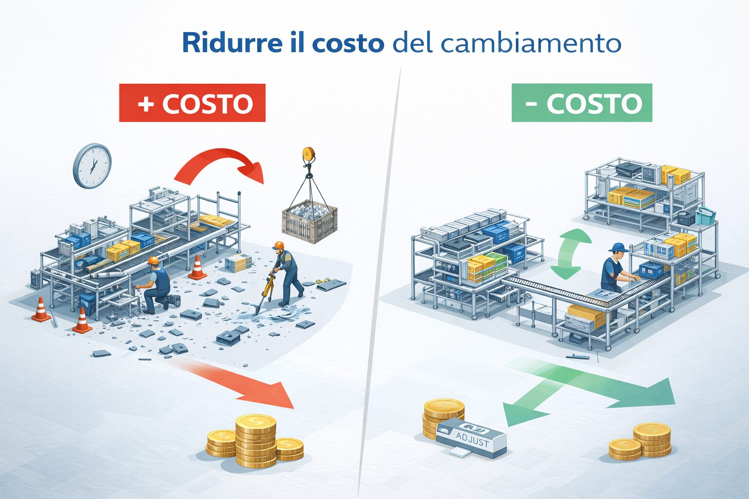 È qui che il metodo Lean Manufacturing trova applicazione concreta: progettare linee, spazi e organizzazione dei materiali pensando fin dall’inizio alla possibilità di cambiare.