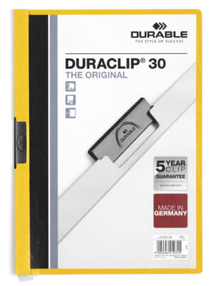 L’originale! E’ la più diffusa cartellina con cilp, inventata e brevettata da DURABLE nel 1959 e prodotta in Germania. Realizzata in PVC di alta qualità con clip in acciaio, copertina trasparente e retro colorato. La clip si adatta al numero di fogli inseriti e il suo perfetto funzionamento è garantito 5 anni. Ideale per presentare e archiviare, in modo professionale, documenti non perforati:tira la clip – inserisci i documenti – riposiziona la clip – semplice! Con DURACLIP® i vostri fascicoli avranno sempre un aspetto professionale, ordinato e organizzato. Maggiori informazioni e novità sono consultabili sul sito www.duraclip.com