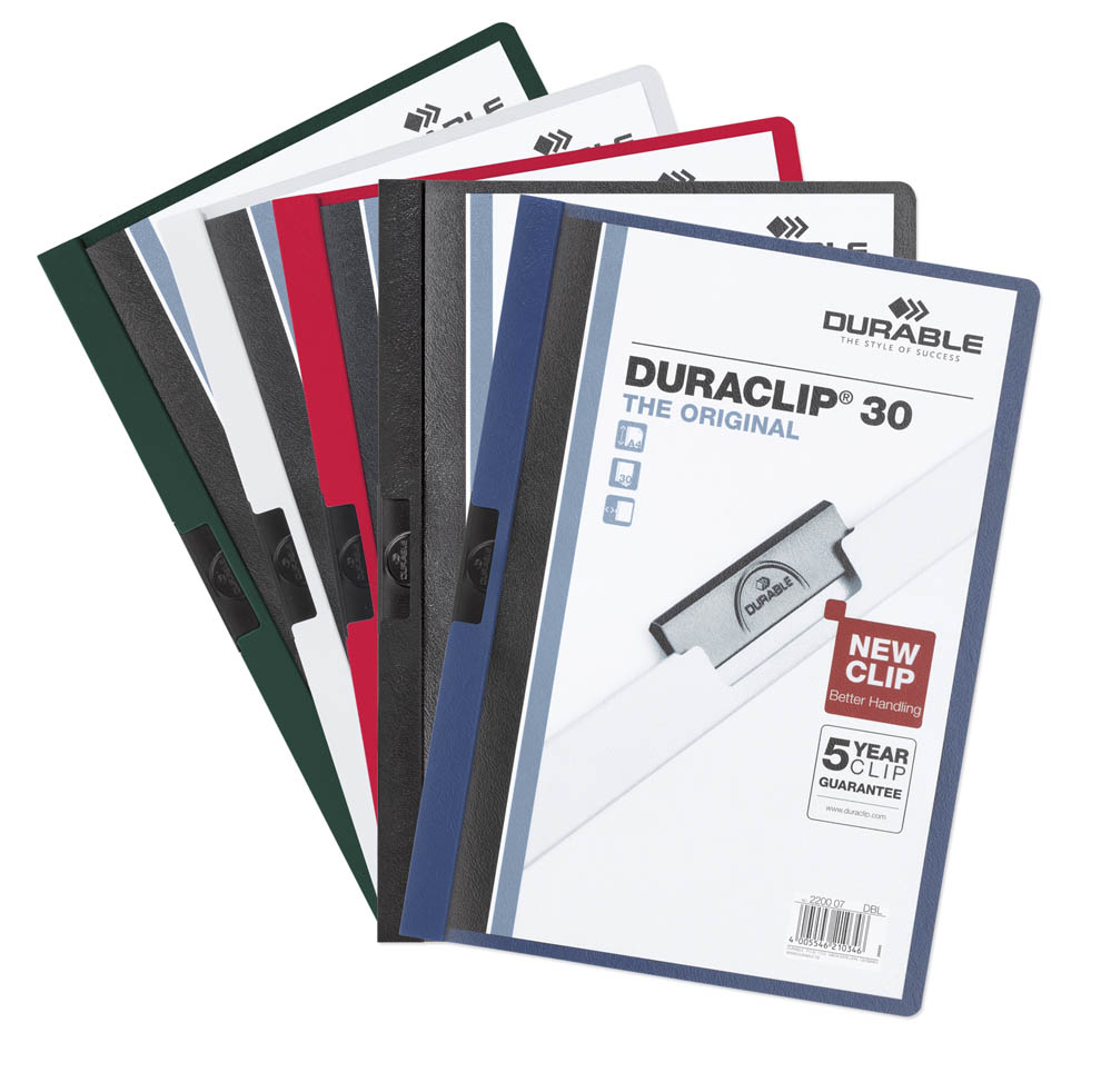 L’originale! E’ la più diffusa cartellina con cilp, inventata e brevettata da DURABLE nel 1959 e prodotta in Germania. Realizzata in PVC di alta qualità con clip in acciaio, copertina trasparente e retro colorato.La clip si adatta al numero di fogli inseriti e il suo perfetto funzionamento è garantito 5 anni. Confezione da 5 cartelline DURACLIP® 30 cod. prodotto 2200.