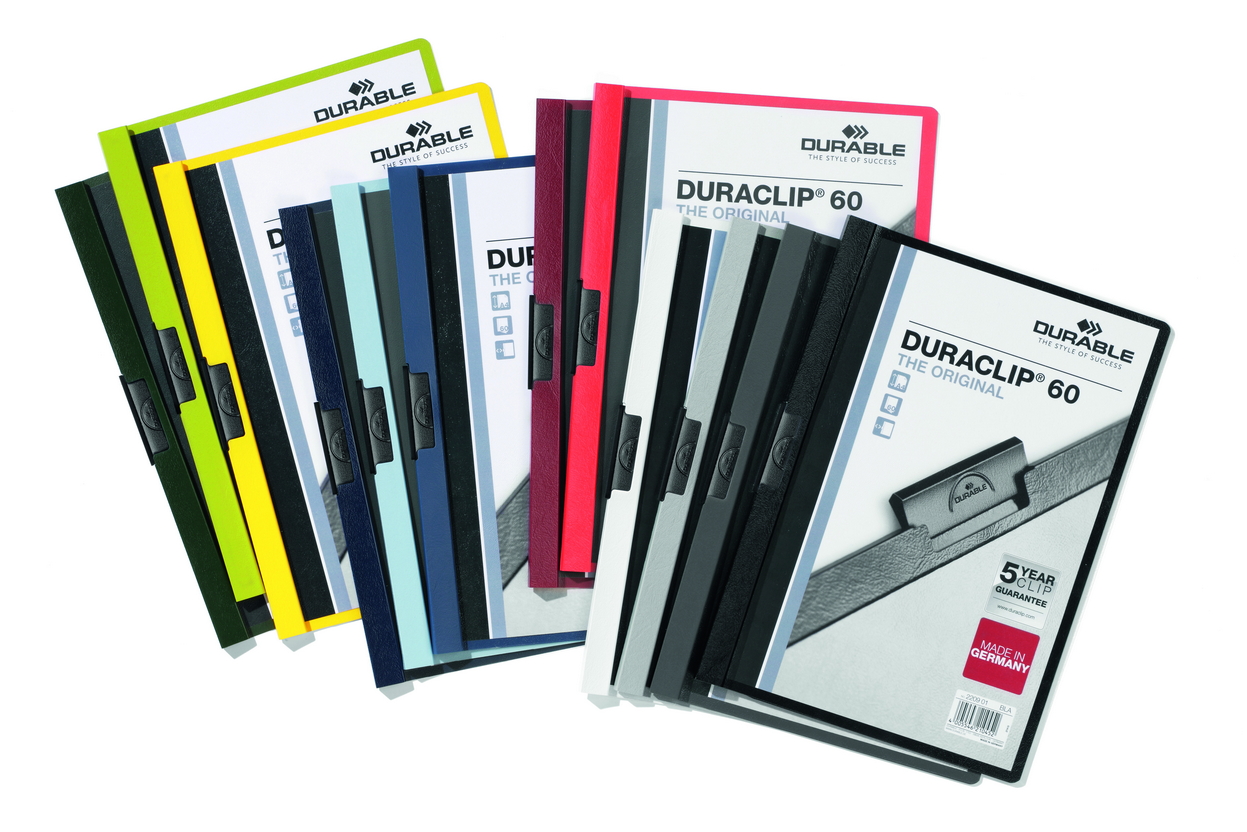 L’originale! E’ la più diffusa cartellina con cilp, inventata e brevettata da DURABLE nel 1959 e prodotta in Germania. Realizzata in PVC di alta qualità con clip in acciaio, copertina trasparente e retro colorato. La clip si adatta al numero di fogli inseriti e il suo perfetto funzionamento è garantito 5 anni. Ideale per presentare e archiviare, in modo professionale, documenti non perforati:tira la clip – inserisci i documenti – riposiziona la clip – semplice! Con DURACLIP® i vostri fascicoli avranno sempre un aspetto professionale, ordinato e organizzato. Maggiori informazioni e novità sono consultabili sul sito www.duraclip.com