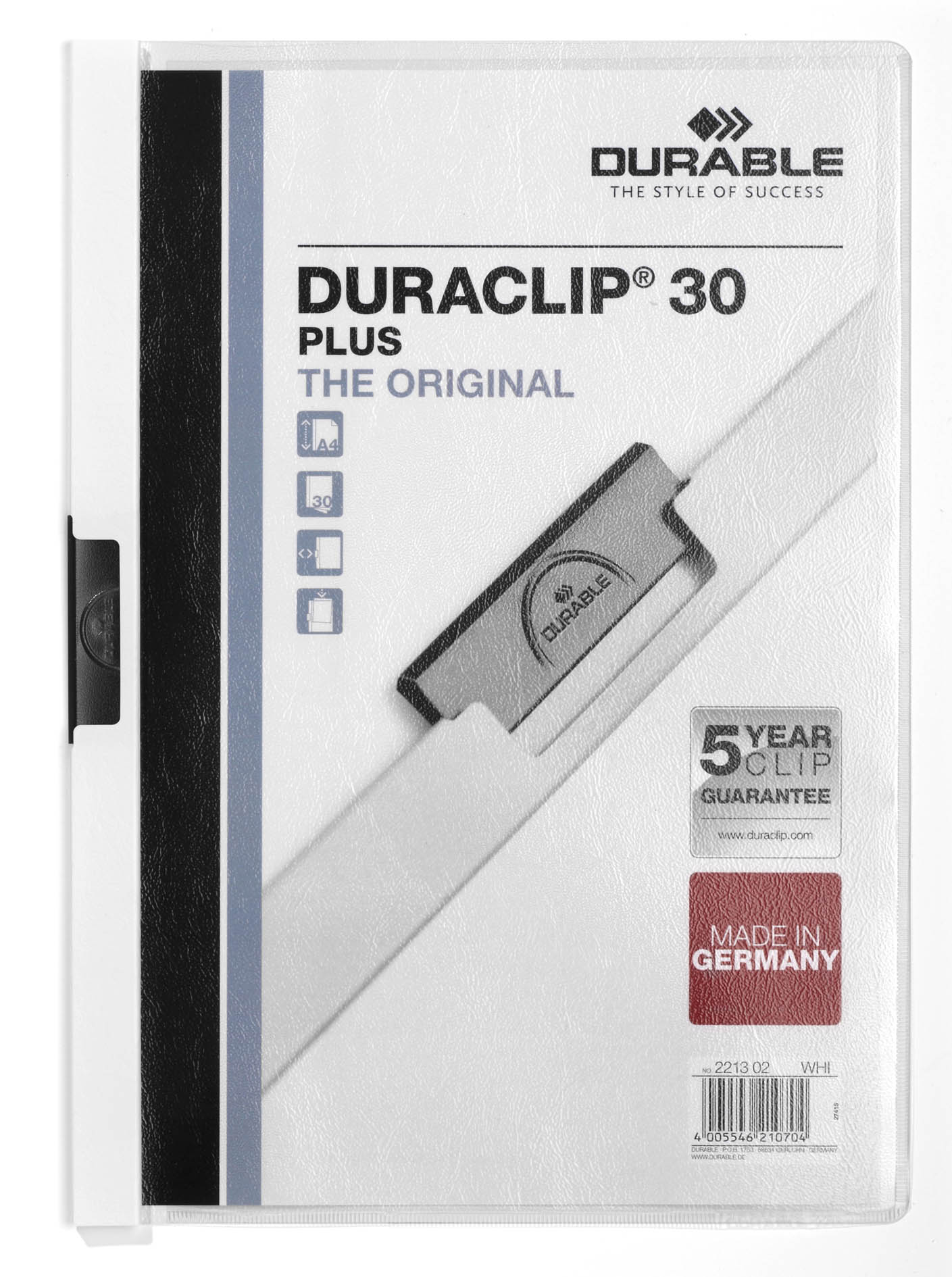 L’originale! E’ la più diffusa cartellina con cilp, inventata e brevettata da DURABLE nel 1959 e prodotta in Germania. Realizzata in PVC di alta qualità con clip in acciaio, copertina trasparente e retro colorato.La clip si adatta al numero di fogli inseriti e il suo perfetto funzionamento è garantito 5 anni. La copertina è dotata di una tasca frontale che ne permette la personalizzazione con loghi, immagini, colori aziendali.Ideale per presentare e archiviare, in modo professionale, documenti non perforati:tira la clip – inserisci i documenti – riposiziona la clip – semplice! Con DURACLIP® i vostri fascicoli avranno sempre un aspetto professionale, ordinato e organizzato. Maggiori informazioni e novità sono consultabili sul sito www.duraclip.com