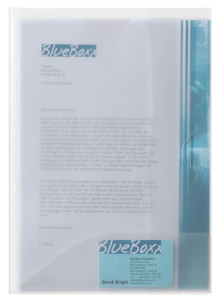 Cartellina formato A4 in polipropilene trasparente con due lembi interni. Dotata di aletta di chiusura sulla copertina e aperture sul lembo interno per il posizionamento di un biglietto da visita. Completa di occhielli per l’archiviazione in registratori e raccoglitori ad anelli.