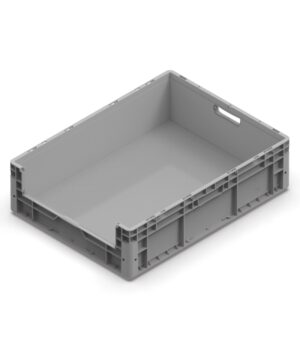CASSETTA NEXIT 800X600X220H MM – FONDO RINFORZATO – PORTATA 80 KG – MANIGLIE APERTE – PICKING LATO CORTO – COLORE GRIGIO 01