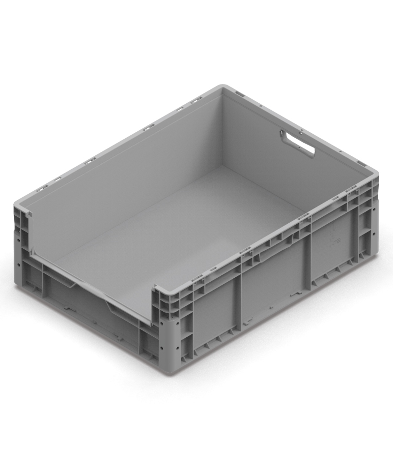 CASSETTA NEXIT 800X600X270H MM – FONDO RINFORZATO – PORTATA 80 KG – MANIGLIE APERTE – PICKING LATO CORTO – COLORE GRIGIO 01