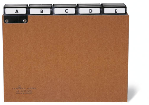 Divisori in cartoncino con cavalierini in plastica saldamente fissati. Fornito con inserti alfabetici rimovibili e perzonalizzabili. Ideali per la catalogazione dei documenti contenuti negli schedari.
