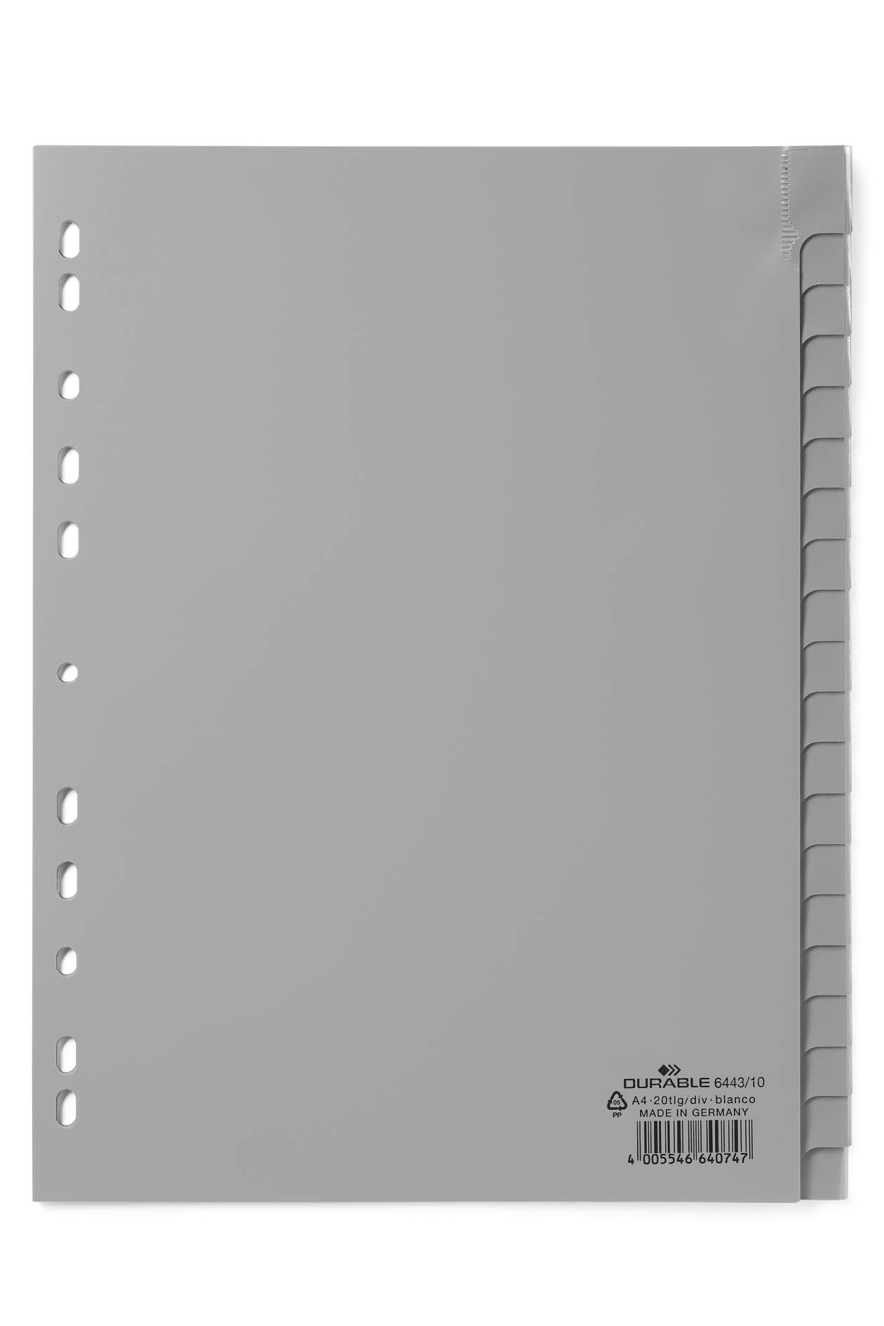 Divisorio in polipropilene resistente allo strappo ed all’usura.Dotato di cavalierini con inserti bianchi personalizzabili, sostituibili con gli inserti prestampati 1-20 e A-Z inclusi nella confezione.