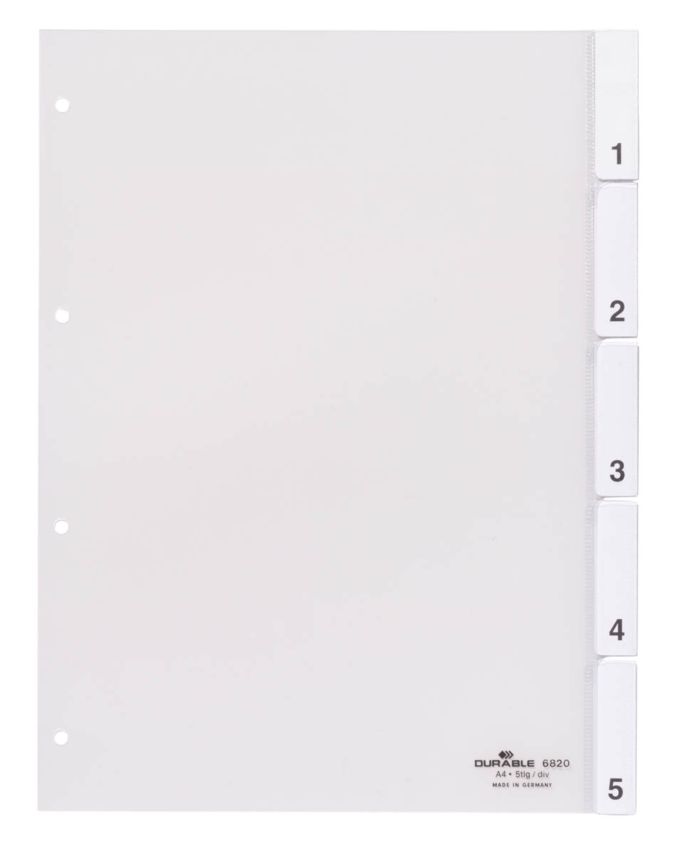 Divisorio con indice frontale personalizzabile, realizzato con materiale di alta qualità che conferisce al prodotto particolare resistenza allo strappo ed all’usura.Dotato di cavalierini con inserti bianchi personalizzabili, sostituibili con gli inserti prestampati 0-5 inclusi nella confezione.
