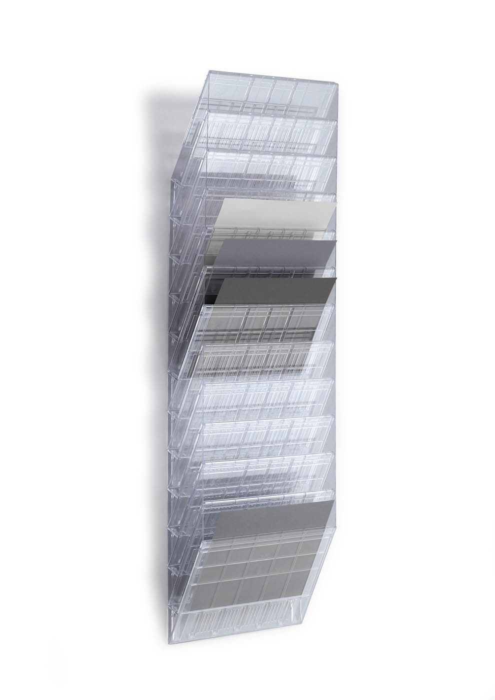 Espositore da parete dal design sobrio e lineare adatto a materiale espositivo formato A4. Include 12 comparti formato A4 orizzontale, profondi 24 mm. Dimensioni: 348 x 95 x 1040 mm (L x P x H)