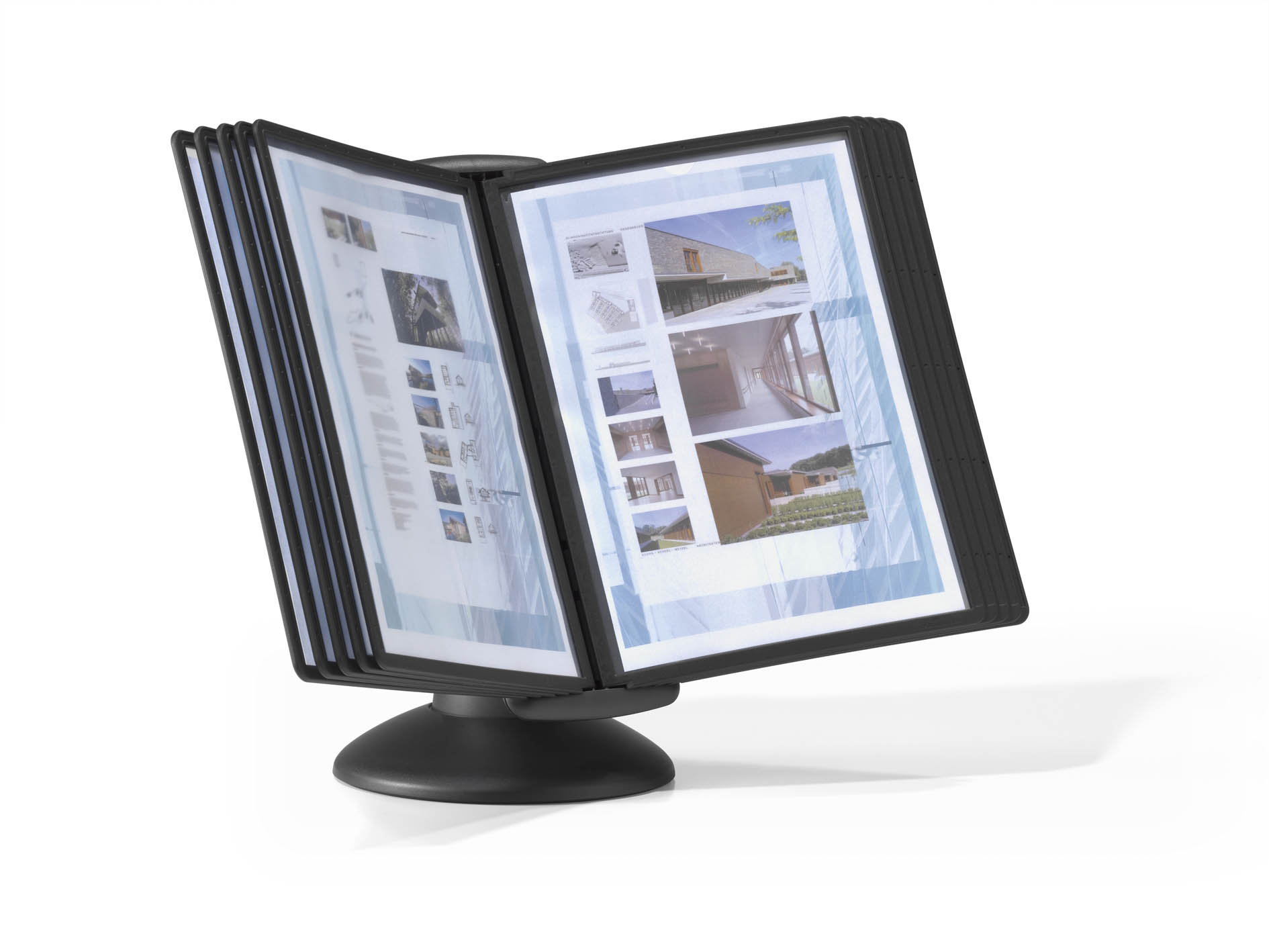 Leggio da tavolo orientabile in ABS dotato di 10 pannelli espositivi SHERPA® formato A4 con cavalierini removibili e personalizzabili.La base è dotata di una sfera galvanizzata alla quale sono applicati i pannelli, che permette di ruotare il leggio di 360° e di regolarne l’inclinazione con un angolo di lettura variabile da 25° a 70°.Ideale per consultare e condividere le informazioni e documenti in uffici, reception e attività commerciali e dove è necessario condividere le informazioni.