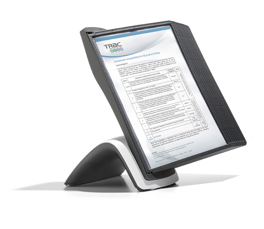 Leggio da tavolo completo di 10 pannelli espositivi in polipropilene f.to A4 (col. nero). Base stabile e antiscivolo bicolore: grigio chiaro e nero. Design moderno e raffinato perfetto in qualsiasi ambiente.