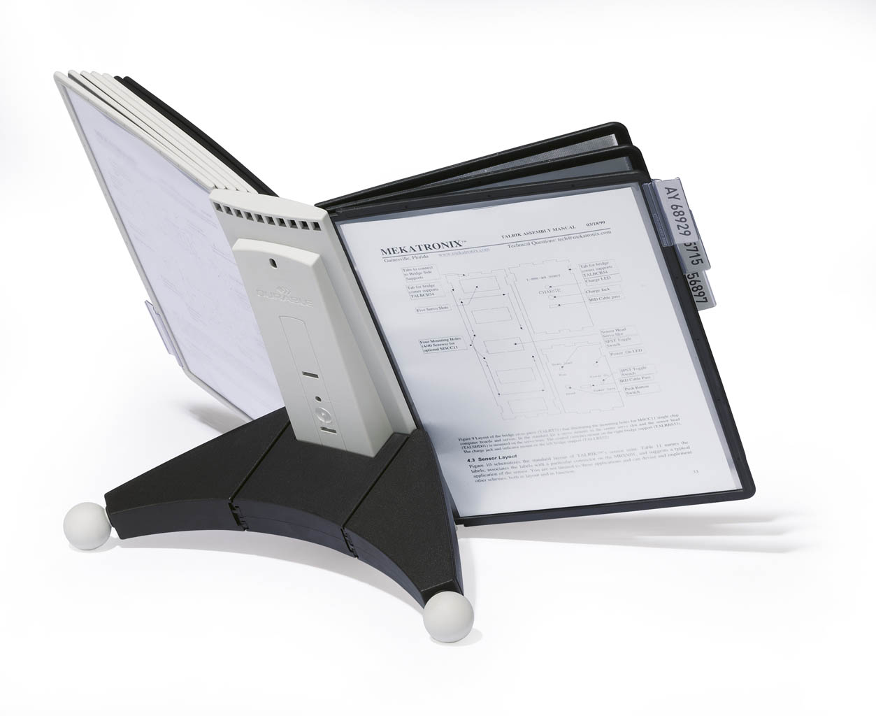 Leggio da tavolo robusto e performante: il design ricercato lo rende ideale per consultare informazioni e documenti in ambienti lavorativi come uffici, reception e attività commerciali. Dotato di 10 pannelli espositivi SHERPA® f.to A4 (colore -00: 5x rosso e nero; colore -22: 5x grigio e nero) e base stabile e antiscivolo. I pannelli sono realizzati in polipropilene e sono dotati di cornice colorata e superficie antiriflesso adatta all’uso con scanner e fotocopiatrici. Cavalierini inclusi nella confezione per una facile catalogazione dei documenti. Il meccanismo a perno consente di rimuovere e riposizionare i pannelli facilmente. Capacità estendibile su entrambi i lati utilizzando il set opzionale completo 5811 oppure il modulo opzionale cod. 5624.