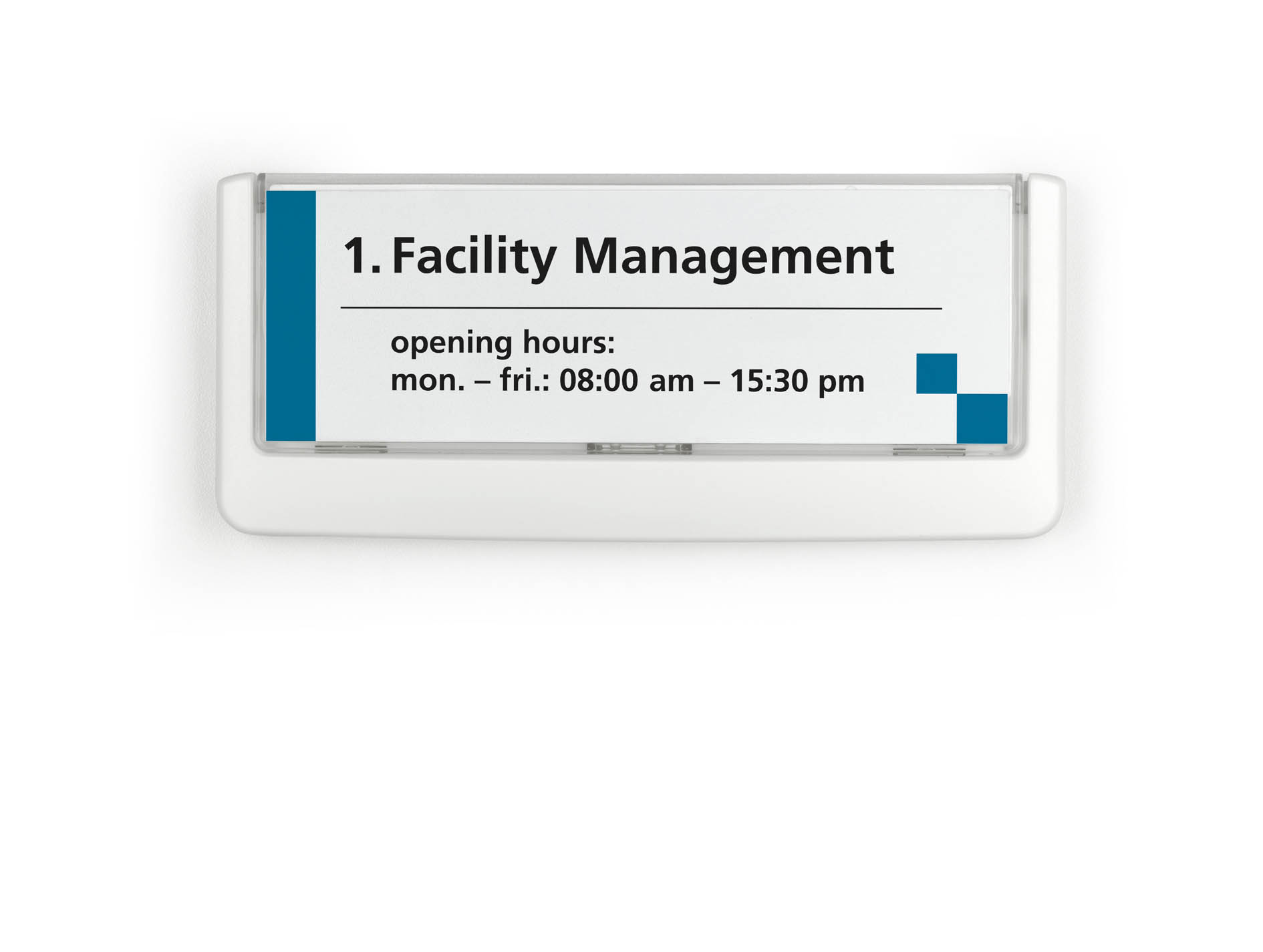 Targa per porte e pareti con bordi arrotondatii dallo stile moderno e funzionale, particolarmente elegante se applicata a superfici vetrate. Ideale per uffici e sale riunioni.Realizzate in ABS si contraddistingue per la facilità di montaggio e di utilizzo. L’apertura dello sportellino trasparente permette di inserire e rimuovere velocemente l’inserto e questo la rende perfetta per l’utilizzo in ambienti, come alberghi e centri congressi, in cui le informazioni devono essere sostituite frequentemente.E’ la soluzione ideale anche in ambienti dove non si desidera praticare fori; si fissa infatti a porte o a pareti tramite il kit con viti oppure con bi-adesivo inclusi nella confezione.L’inserto in cartoncino incluso può essere personalizzato e stampato on-line tramite il software gratuito DURAPRINT® sul sito www.duraprint.it